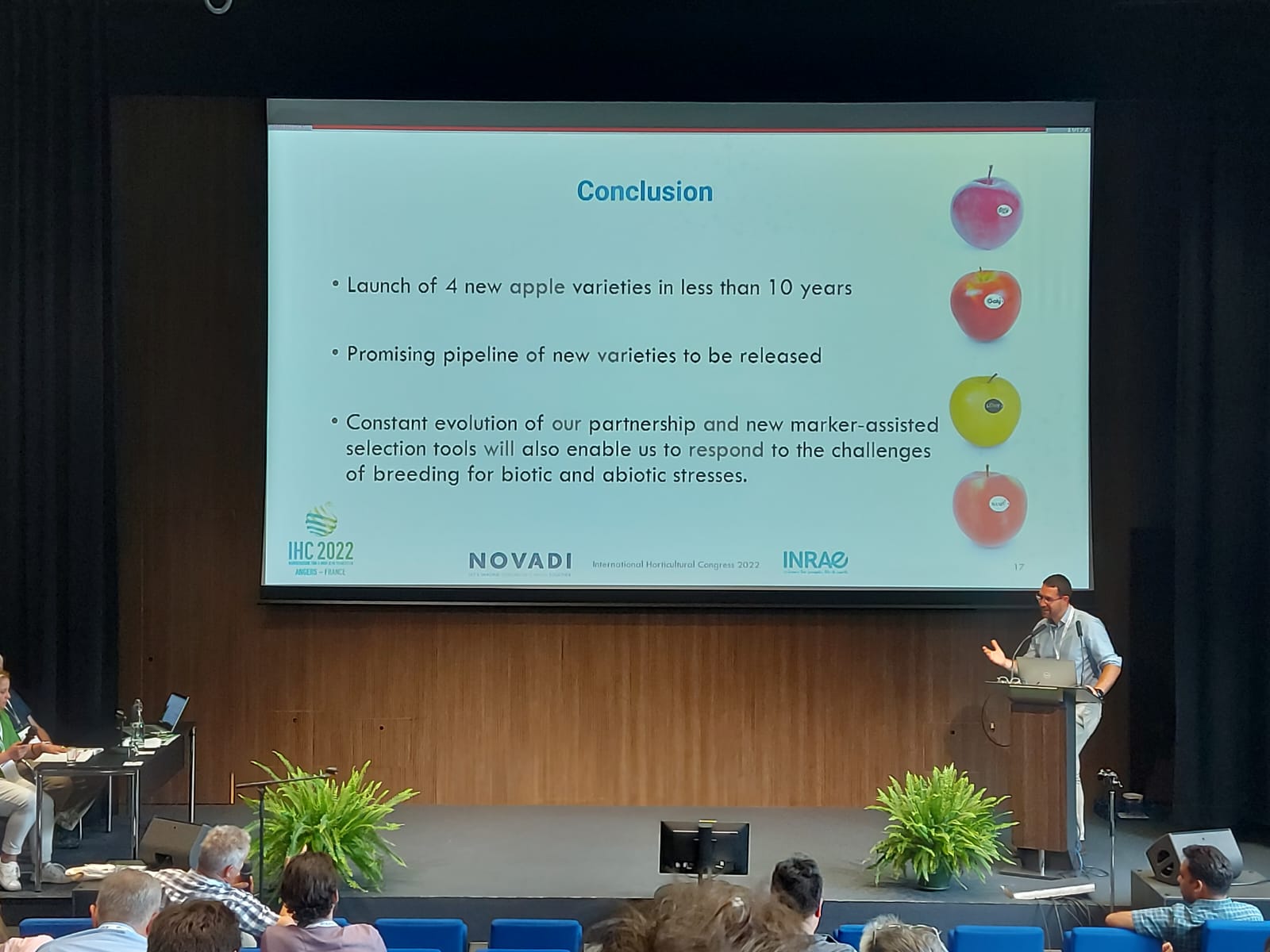 Ensuite, le vendredi 19 aout lors des restitutions orales du symposium S01 “breeding and effective use of biotechnology and molecular tools in horticultural crops”, NOVADI a présenté son article portant sur la collaboration entre INRAE & NOVADI. Cet article explicite les bases du partenariats, le travail spécifique de chaque structure et les évolutions envisagées dans les années futures pour poursuivre et optimiser la sélection de variétés élites.